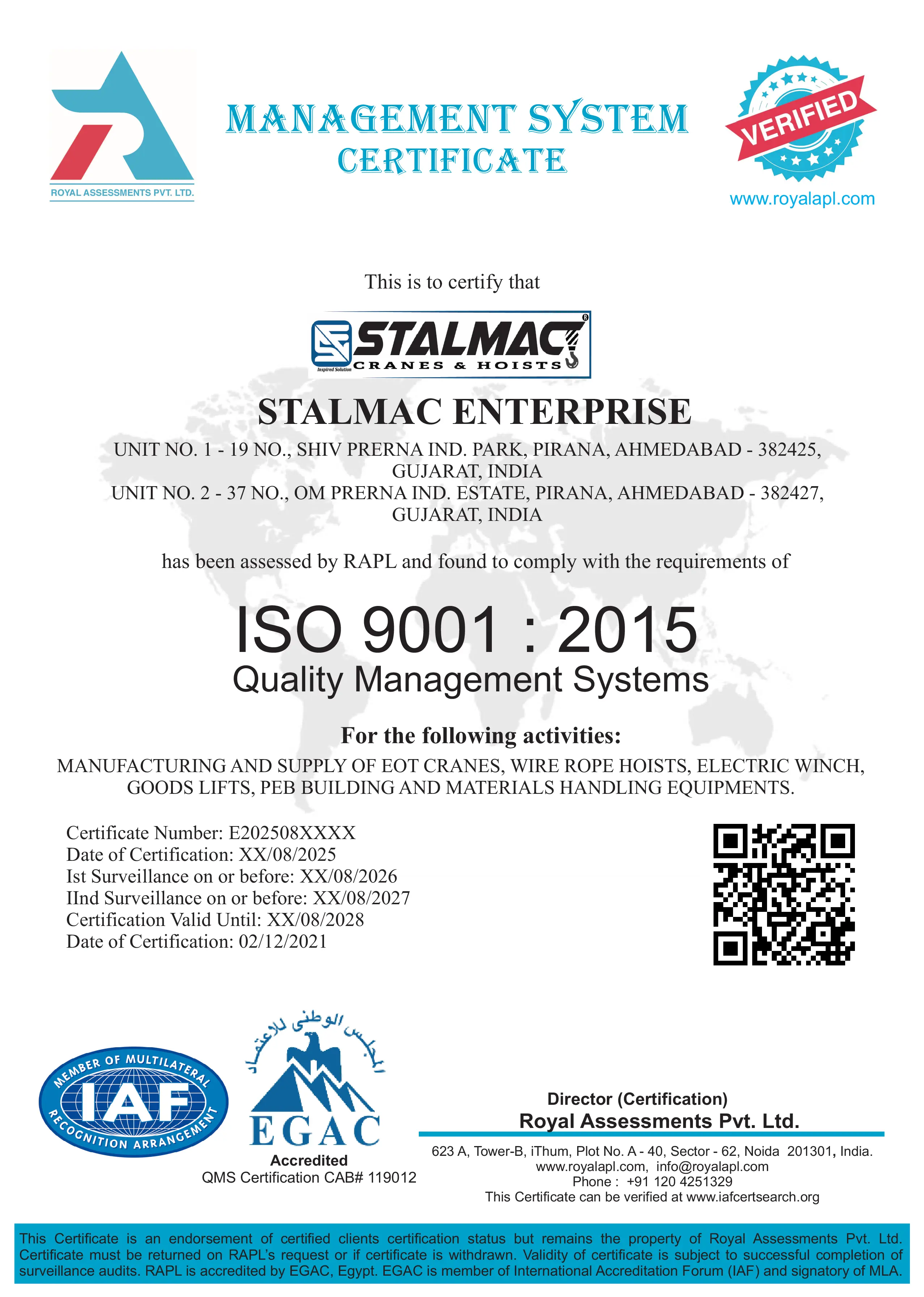 Stalmac Cranes was established in Ahmedabad, India, 2011. We are a Leading Manufacturing of EOT CRANE – WIRE ROPE HOIST – GOODS LIFT – ELECTRIC WINCH – CAGE HOIST – GOLIATH CRANE – UNDERSLUG CRANE – CHAIN HOIST – MATERIAL HANDLING EQUIPMENT, Our sales team can technically assist the consulting engineers during design stage to decide on the key parameters of the production layouts and building in terms of material handling and goods. The selection of the correct material handling. equipment’s can provide a cost saving to your operations and also building. dimensions can be optimized to show substantial savings on the initial project costs.